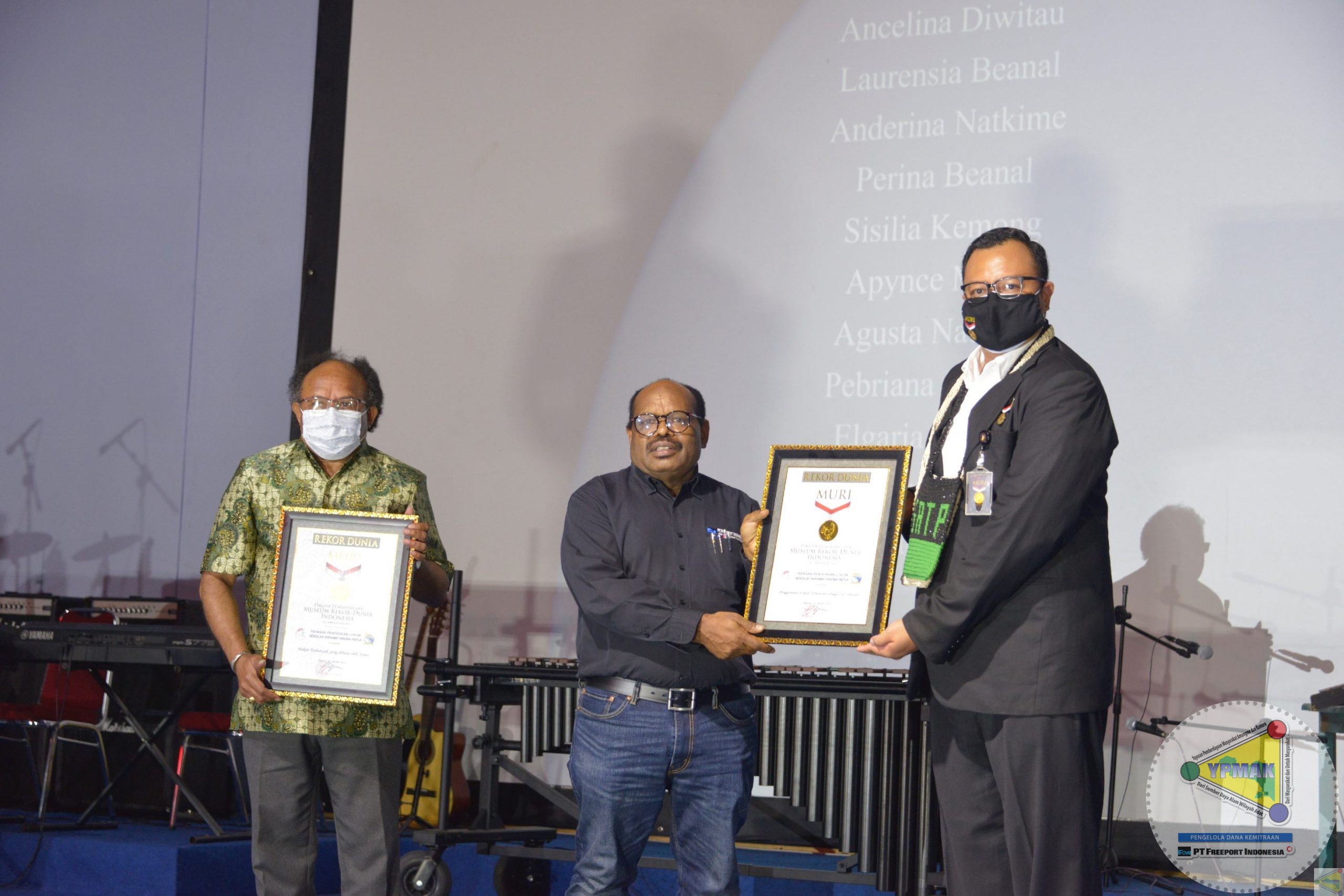Wakil Direktur Grant Making YPMAK, Yohan Wambrauw (kiri) dan Vice Presiden PT Freeport Indonesia Bidang Community Development Nathan Kum saat menerima piagam penghargaan rekor Muri dari Senior Manager MURI Awan Rahargo. (YPMAK/MISKAN)